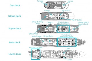 Access to the luxury yacht is easy via passerelle or the wide teak swimming platform. Once onboard life unfolds over five spectacular decks. MOONLIGHT II offers accommodation for an incredible guests in cabins.